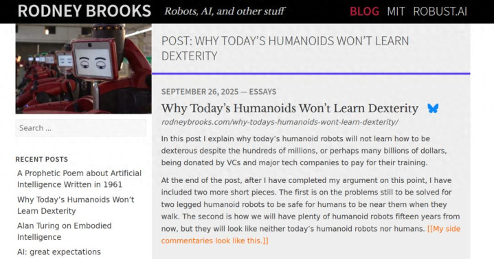 在《纽约时报》以及个人技术博客中,Brooks 对当下人形机器人热潮给出了极为一致的否定判断。在他看来,这一轮浪潮的问题不在于进展是否足够快,而在于整个行业正在被一套错误的判断体系与技术顺序所牵引。
